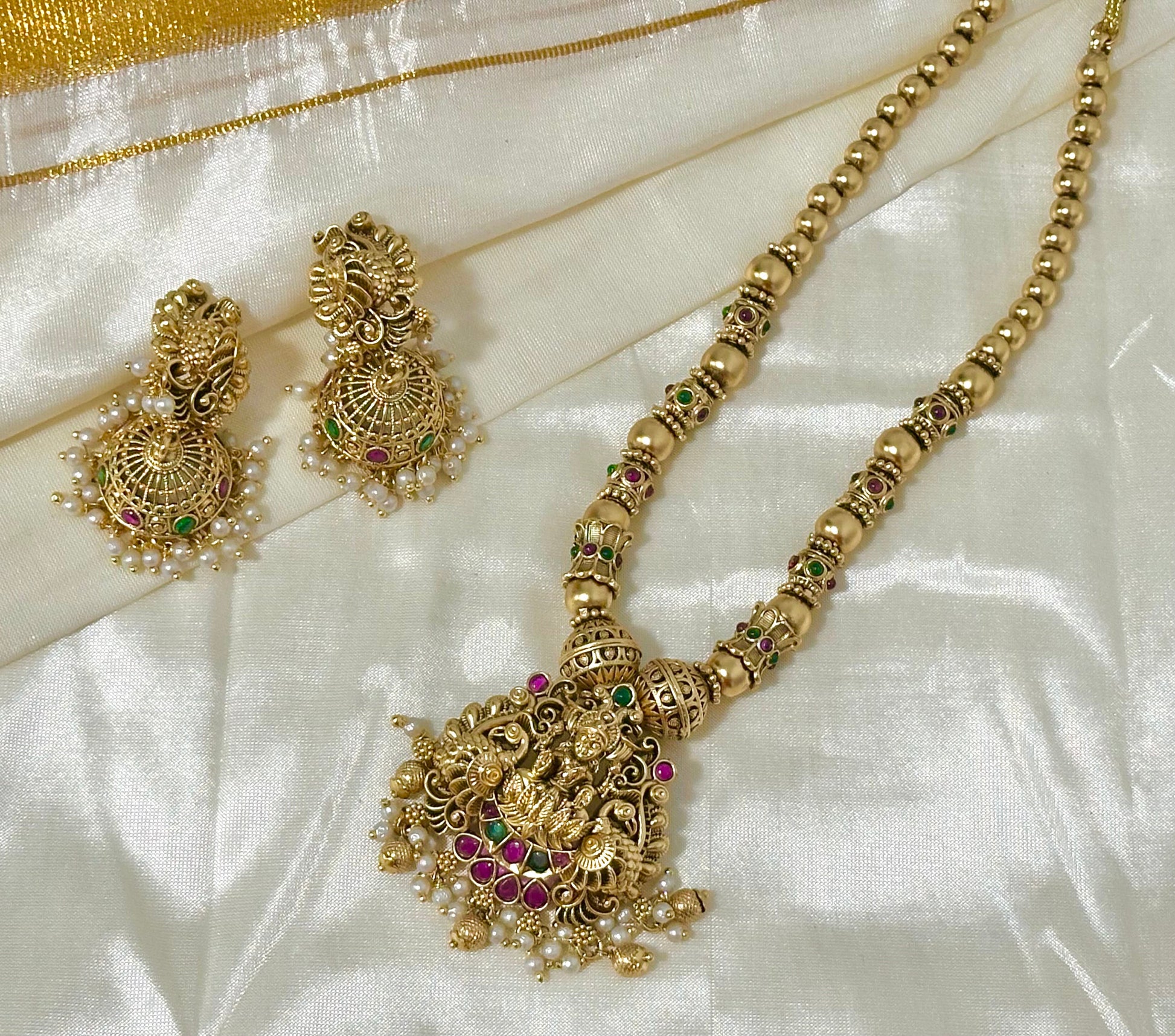 The focal point is the substantial pendant, showcasing a finely detailed depiction of Goddess Lakshmi, flanked by graceful peacocks , all exquisitely embellished with colorful stones and delicate pearl drops. The craftsmanship evokes a rich, traditional aesthetic.