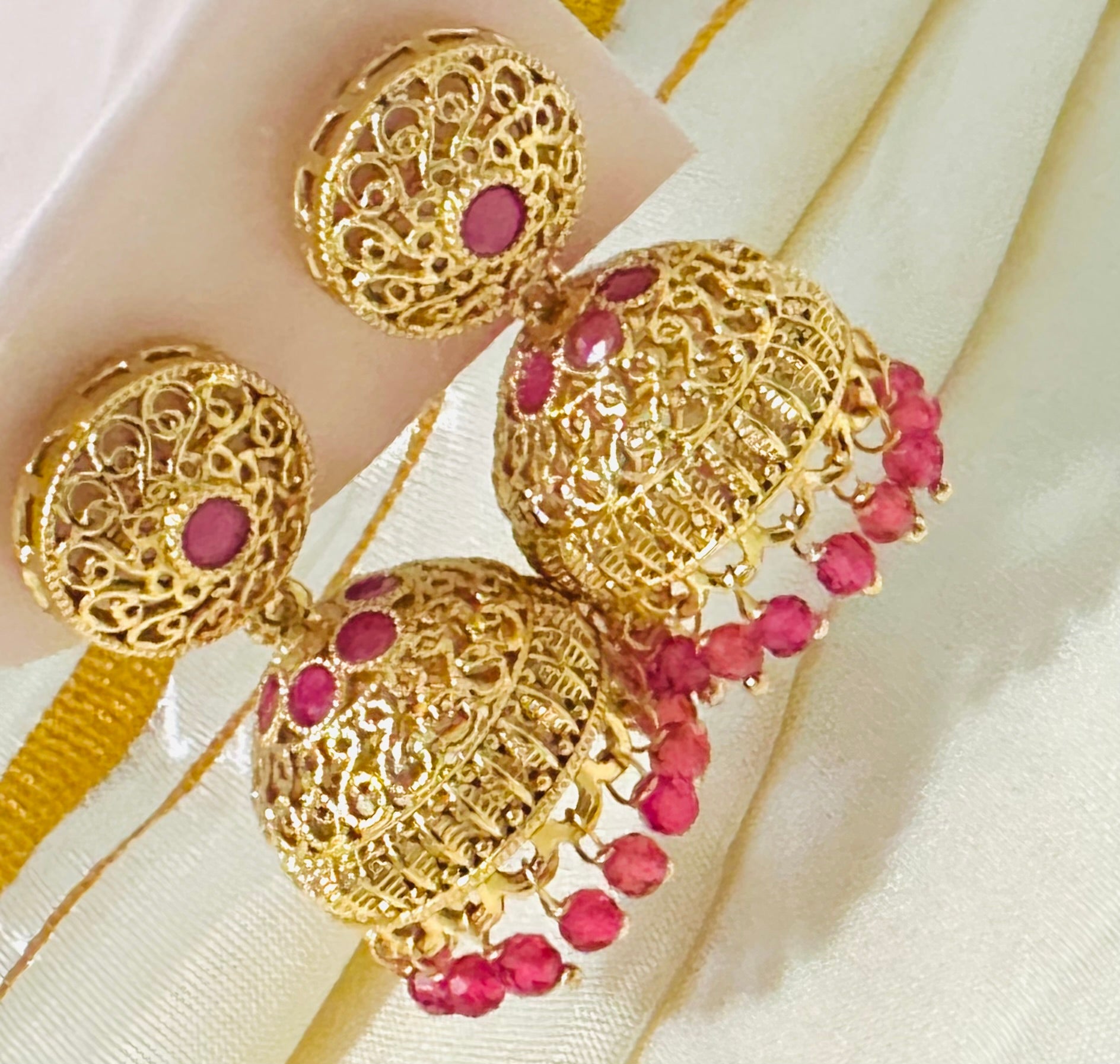 Design: Circular filigree stud with a central ruby or blue , connected to a dangling domed Jhumka featuring rich textures, a band of gold beads, and a vibrant fringe of ruby-red or blue faceted beads.