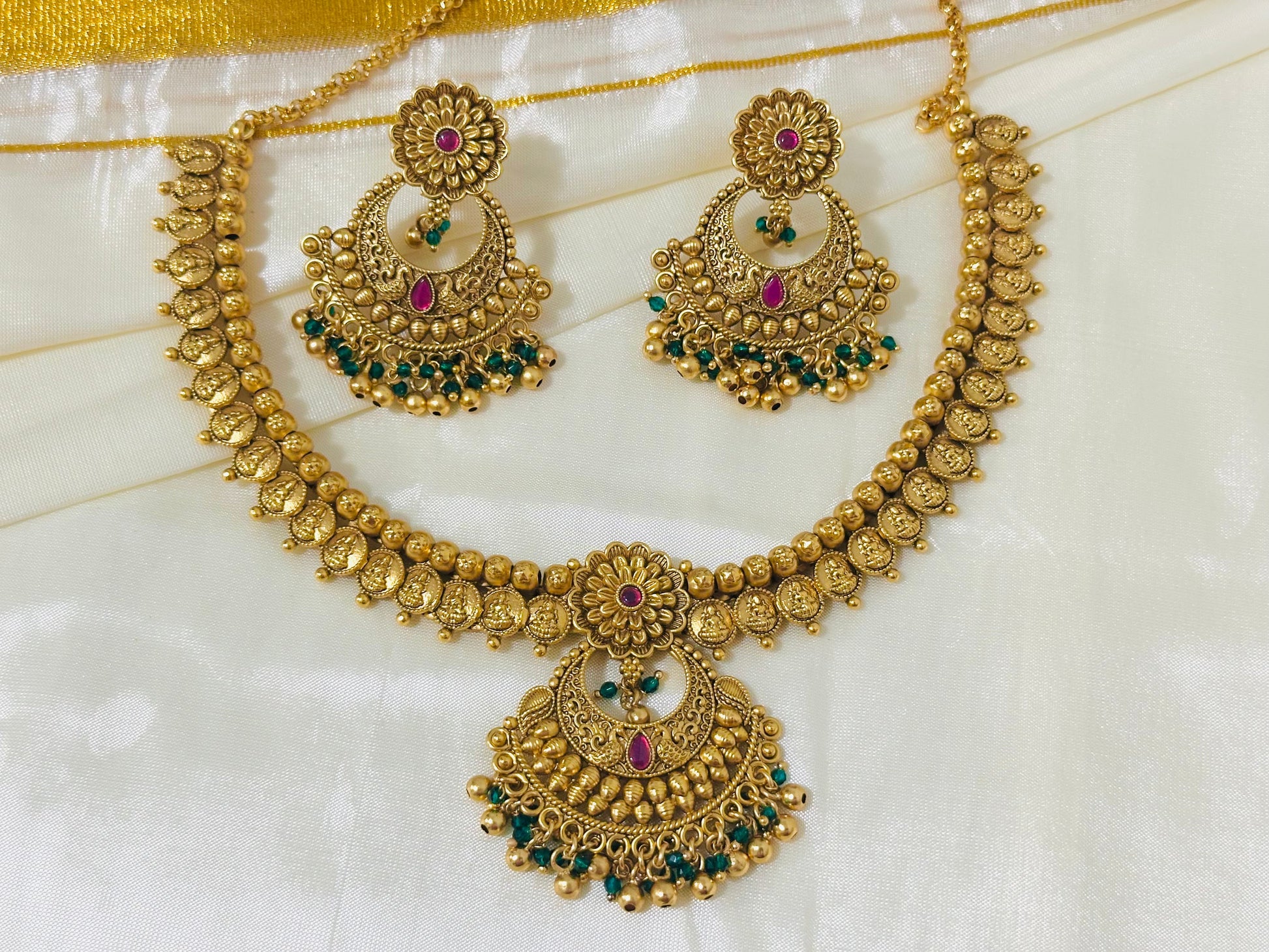 Drape yourself in classic elegance with this stunning antique gold-toned jewelry set, featuring a beautifully crafted choker necklace and perfectly matched jhumka earrings. This set embodies traditional charm with intricate detailing, making it ideal for festive occasions and cultural celebrations.