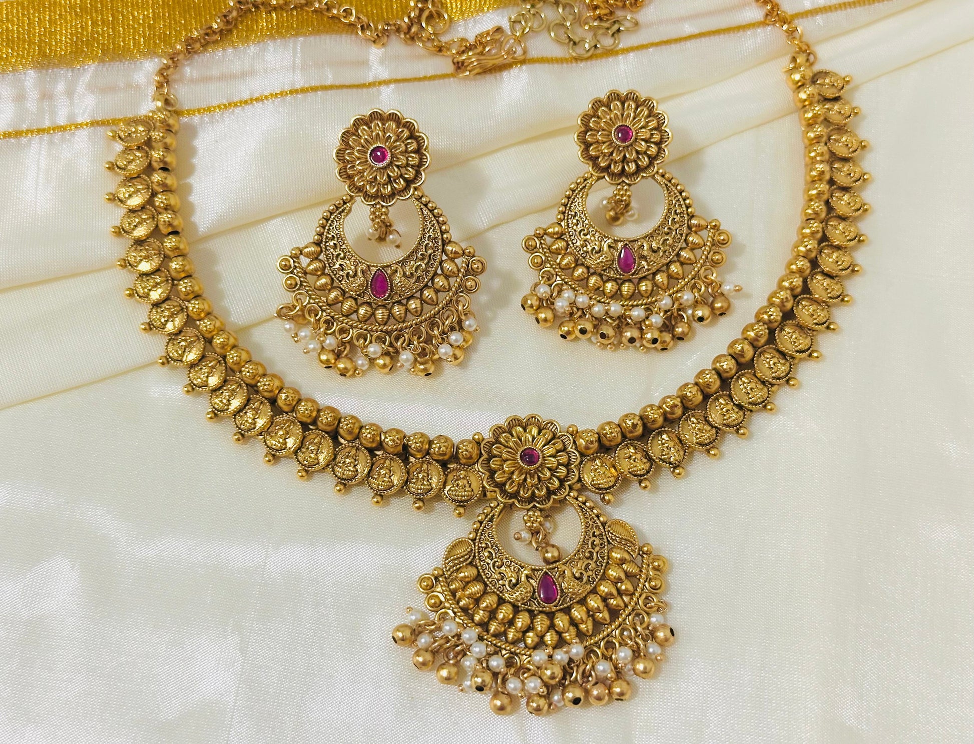 Exquisite Antique Gold-Toned Choker Necklace and Jhumka Earring Set with Floral and Crescent Motifs